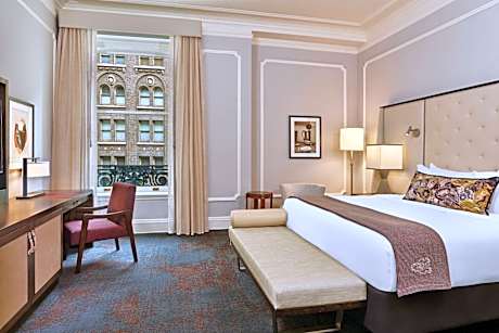Each room at the Palace Hotel features luxurious bedding, a 48-inch flat-screen TV, marble baths, and rain showers. Select suites offer separate seating areas and views of Market Street, enhancing the guest experience with added comfort and elegance.