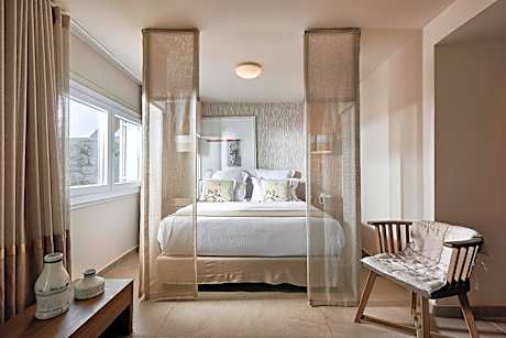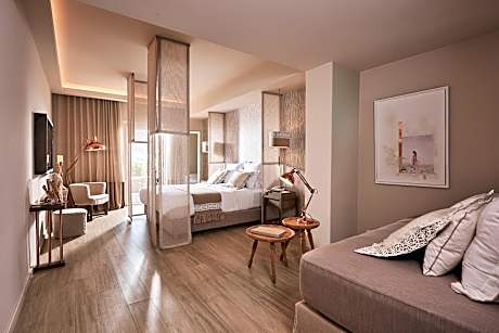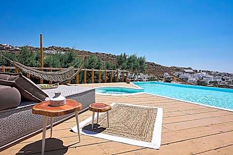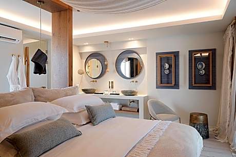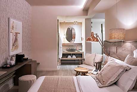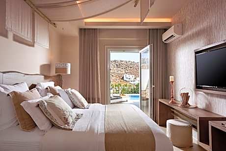 Palladium Hotel is located at Platys Gyalos, a 5-minute walk from Psarou and Platys Gyalos Beaches, as well as just a breath away from the famous Nammos. It is a 5-star hotel featuring free WiFi in all areas, an outdoor and an indoor heated swimming pool, a lavish spa and fashion boutique. A state-of-the art fitness center and sauna are also available. Each of the elegant suites and rooms is air-conditioned and includes a seating area, a flat-screen TV with satellite channels and furnished private balconies. All units in the hotel are equipped with a coffee machine, hair dryer and ironing facilities. Korres toiletries can be found at the private bathroom. Some units also feature a private pool or hot tub. Guests are greeted with a welcome drink and wake up to a rich American breakfast buffet served daily. Guests in rooms with a private pool can also enjoy a floating breakfast in the privacy of their own pool. Services that can be enjoyed at the spa center include massages, hair, beauty and facial treatments, hammam and hot tub. . La Veranda restaurant serves innovative Mediterranean cuisine created from fresh Greek products. Palladium’s lobby bar, overlooking the Aegean sea and the starlit swimming pool offers Signature cocktails. The poolside bar offers lounge-style sunbeds and refreshing drinks. Other options include a snack bar. In-room dining is also available upon request. The hotel’s 24-hour front desk can arrange baby-sitting and laundry service. Guest services include free two-way transfer to/from Mykonos Airport/Port, concierge service and doctor on call. Mykonos town and Mykonos airport are 10-minute drive away. Free on-site parking is available. Guest services include free two-way transfer to/from Mykonos Airport/Port from 07:00 until 00:00. License Number(s): 1067288