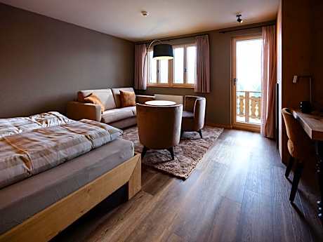 This traditional 3-star hotel in the car-free village of Bettmeralp offers panoramic views of the Valais Alps and the Matterhorn. The Bettmeralp cable car is only 1312 feet away. The village can only be reached by cable car. Pets are not allowed on the hotel grounds. Our rooms have just been renovated with a modern ‘alpine chic’ concept. They feature a mix of traditional elements and modern designs that focus on high-quality, natural materials. Would you like to be able to enjoy the great views of the mountains and of the Mary of the Snow Chapel? Our Comfort South-facing rooms with balcony are sure to make you dream during both day and evening. Or you can choose the Romantic new South-facing Junior Suite with freestanding bathtub and panoramic views. In order to take advantage of the best prices, we recommend that you book directly via the hotel or our homepage. The restaurant serves traditional Swiss cuisine. Booking by e-mail before arrival is recommended. Relax on the Panorama Hotel's sun terrace.