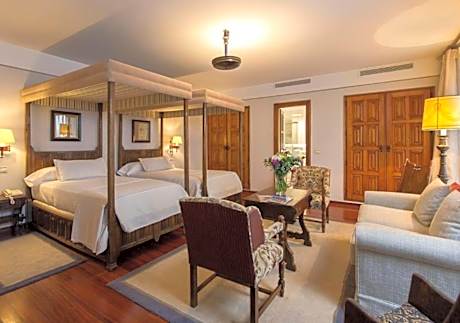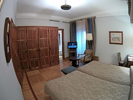 Each spacious room at Parador de Santiago - Hostal Reis Catolicos is designed for comfort, featuring four-poster beds, satellite TV, and a private bathroom. The hotel’s historic charm is evident in its vaulted ceilings and stone archways, creating a unique atmosphere that transports guests back in time.