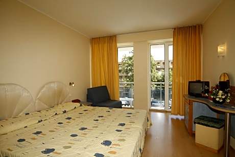 Enjoying a peaceful and quiet location in green surroundings, the renovated Hotel Perla is a pleasant and charming venue in the popular Golden Sands resort. The modern hotel offers excellent facilities and services, provided by a friendly and dedicated staff. The calm and relaxed atmosphere of the Perla with a beautiful, lush garden will make your stay unforgettable. The rooms are cleaned every day. They have carpets and laminated hardwood floors. The bright and spacious interior will add to a good night’s sleep. The restaurant has a spacious garden terrace and a barbecue area. Your dinner will be accompanied by live music and a great entertaining program. Sip delicious cocktails at the lobby bar which is open 24 hours a day. Enjoy the outdoor pool with a children’s section and the refreshments at the pool bar. The center of Golden Sands with its choice of restaurants, cafes and bars is just 550 yards from the hotel, with a bus stop 10 yards from the Perla.