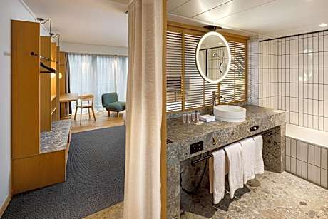 Providing free toiletries, this suite includes a private bathroom with a bath, a shower and a hairdryer. Guests can make meals in the fully equipped kitchenette that features a refrigerator, kitchenware and an oven. The air-conditioned suite provides a mini-bar, a safe deposit box and heating.
