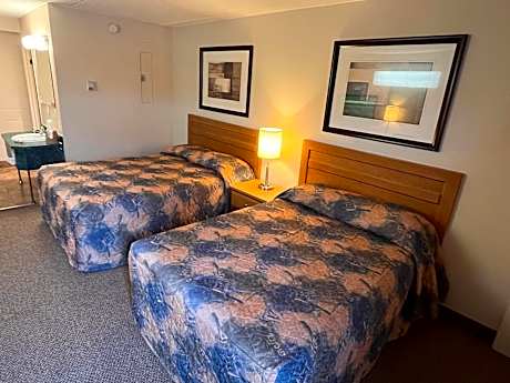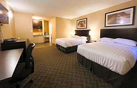 A microwave, refrigerator and coffee-maker are provided in this room with two double beds. Free Wi-Fi and a cable TV are featured. A seating area is included.