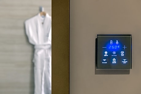 - Osłona akrylowa oddzielająca gości od personelu w głównych obszarach kontaktu