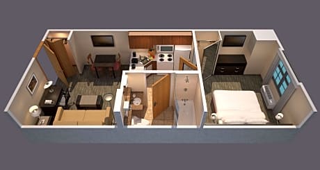 This studio features cooking and dining utensils, a toaster, and coffee maker.