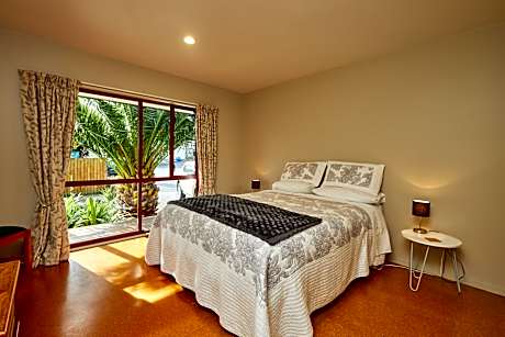 This room features a queen bedroom with ensuite and a separate lounge/dining area with kitchenette facilities. The living area opens onto the garden.