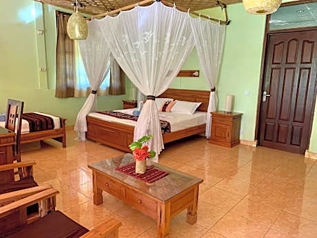 The Budi Sun Resort, Flores, Maumere awaits you for a peaceful and relaxing stay. Popular with snorkellers and divers, the resort is located in Maumere Bay National Park on Wairita Beach and offers an outdoor pool, spacious beach facilities and a restaurant. The beach is only a few steps away and snorkeling or swimming is possible at any time. Guests can enjoy free Wi-Fi in all public areas and on the terraces. All rooms have air conditioning. The Sea View Bungalows are equipped with a fridge and coffee/tea maker. The bungalows have a private bathroom with hot water shower, towels and beach towels. The resort is only a 20 minute drive from Frans Seda Airport ‘MOF’ and therefore also suitable for a shorter transit stop. Many local attractions and excursion destinations can be reached in less than 60 minutes by car. Hot spring at the foot of the volcano Egon, traditional salt extraction plant ‘Siedesalinen’, walk-in mangrove forest with tree nursery, viewpoints over the entire bay, countless beaches (also with night food markets) viewpoint with 46 ft high statue with flower garden and view of the south and north coast of the island, various large regional markets, the volcano Egon, which is popular with hikers. A 3-hour drive from the accommodations is the Kelimutu volcano, which is known for its 3 colorful lakes. There is an offshore house reef at the property which is easily accessible and diving and snorkeling excursions can be organized for you. Laundry service, car with driver or self-drive scooter are available for an extra charge. The Budi Sun Restaurant serves a selection of regional and international specialties. You can also place an order and enjoy your food/drinks in your room, on the terrace or on the beach.