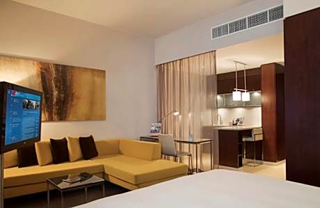 This studio has a queen bed and overlooks overlooking ADNEC or Capital Center Arjaan by Rotana, and has a small kitchenette. It features a private bathroom, a small sitting area with a sofa for 4 people, coffee table, wardrobe and desk. It has a 32-inch LCD flat screen.