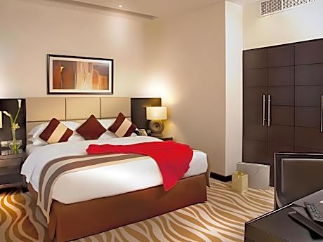 The suite features carpeted flooring, individually controlled air-conditioning, Multi-channel TV, IDD phone and Complimentary Internet Access, a kitchen sink, counter, stove and cookware, lounge area furnished with a comfortable sofa & TV, a separate bedroom with a king sized bed, TV and an executive desk. The suite also features a Luxurious Bathroom with WC, bathtub & shower.