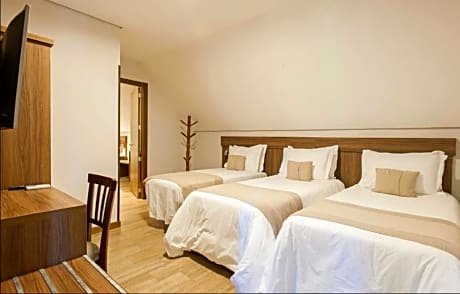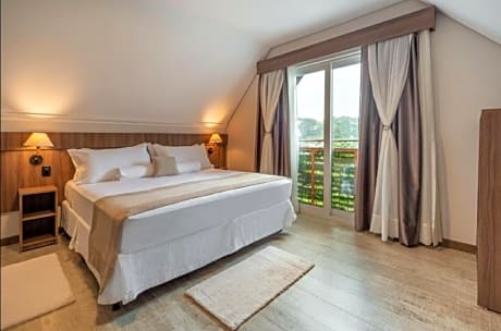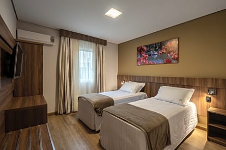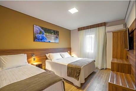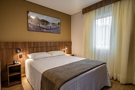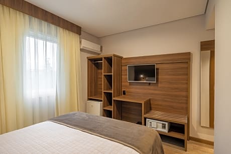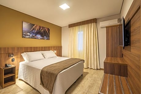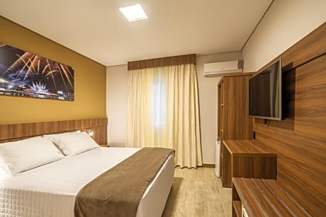 Deluxe double is 172 square feet and includes a queen-size bed 150-154 width plus cable tv and hairdryer.
