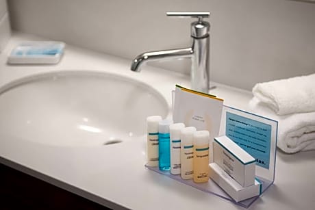- Osłona akrylowa oddzielająca gości od personelu w głównych obszarach kontaktu