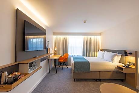 The Holiday Inn Bristol Airport, is over a 2 mile drive from Bristol Airport and 12 miles from Bristol City Center. The bright bedrooms each have large screen TV with the ability to cast from your devices. All rooms feature air conditioning, free Wi-Fi access and a private bathroom with free toiletries. Some rooms also provide cozy dressing gowns and slippers. The Holiday Inn Bristol Airport has a 24-hour reception desk with real-time airport departure screens. There is also a spacious sun terrace and a compact fitness room. Guests can enjoy international cuisine in The Spot Kitchen & Bar, which also offers 24-hour room service. A continental breakfast buffet is available from 04:00 and a full English breakfast is served from 06:00. There is also a lounge bar with flat-screen TVs offering a variety of food and drinks in a relaxed setting. Holiday Inn Bristol Airport is just a 20-minute drive from the sandy beach and seaside attractions of Weston-Super-Mare. The magnificent Cheddar Gorge is a 15-minute drive away.