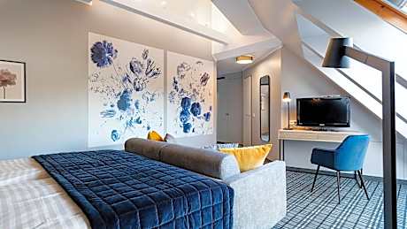 Bright room offering a work desk, seating area and a mini-bar.