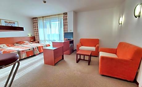 Offering easy access to the main beach and the promenade of the Sunny Resort, the Fenix hotel features a large swimming pool with a children's section. Also a kids' club is there at the Hotel Fenix - All Inclusive to keep the little ones entertained. Fenix Hotel is located on the first line, right across the promenade in Sunny Beach. The hotel combines space, comfort, and tranquility within an extensive green area just steps away from the sea. The hotel offers a peaceful and relaxing atmosphere, making it an excellent choice for both family holidays and guests seeking a quiet escape from the lively resort surroundings. The hotel features some of the largest rooms in the area — bright, functional, and well suited for couples, families, and longer stays. The generous space and thoughtful amenities ensure comfort and a true sense of freedom throughout the stay. Guests will enjoy a comprehensive All Inclusive program, including breakfast, lunch, and dinner with a rich variety of tasty dishes, snacks between meals, and refreshing drinks throughout the day. The restaurant offers a pleasant atmosphere, while the lobby bar and pool bar complement the experience with a wide selection of beverages. All included in the price! The hotel offers a spacious outdoor pool area, sunny terraces, and lobby and pool bars serving drinks throughout the day. For younger guests, there is a fun animation program, a mini club, and dedicated play areas, while adults can enjoy relaxation, sports activities, a fitness center and themed entertainment. Fenix Hotel also provides guest parking and a conference hall, suitable for meetings, trainings, and small events. The combination of greenery, quiet surroundings, and well-designed facilities makes the hotel an excellent choice for both leisure and business stays. With its excellent location, friendly service, and wide range of amenities, Fenix Hotel offers a comfortable and memorable seaside holiday.