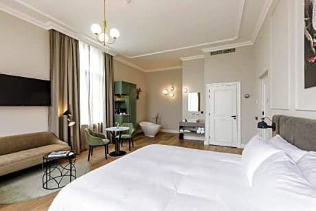 This small, modern room is attractively decorated. The room has three high windows and a view of the historic villa. This room has air-conditioning, free coffee, tea and water and a smart TV. Pets are not allowed in these rooms.