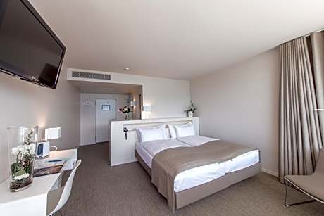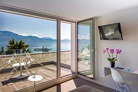 This 4-star design hotel in the heart of the Lavaux UNESCO World Heritage Site overlooks the vineyards and Lake Geneva and is a 2-minute walk from the Epesses train station. It offers free WiFi, a small on-site private car park with free parking spaces (reservation not possible) as well as public parking spaces nearby. The bright and modern rooms at Hotel Lavaux include a large flat-screen satellite TV, a seating area, triple glazed windows, high quality bedding, a tea/coffee maker, and a bathroom with toiletries and a hairdryer. Some rooms on the street-facing side have a balcony or terrace overlooking the lake and the mountains. All apartments also include a fully equipped kitchen. A rich breakfast buffet is served every morning in the restaurant hall. The Masaniello restaurant has a summer terrace and serves Italian dishes. Guests can also relax on the large panoramic roof terrace. Hotel Lavaux is on the canton route between Vevey and Lausanne, a 10-minute drive from each town. The hotel is a 5-minute walk from the lake shore and a 10-minute walk from the center of Cully. Geneva Airport can be reached in a 1-hour drive.
