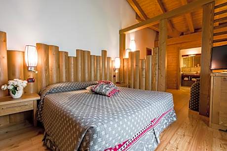 Room with attached bathroom with Alpine-style décor, wood floors, a mini-bar and a safe. The private bathroom is complete with a hairdryer. WiFi is free.