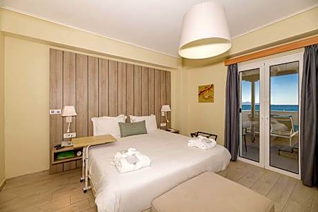 This room is located on the ground floor and offers limited side views to sea from balcony. It features LCD TV, air conditioning, sun lounger, entertainment system, WiFi, bathrobe and espresso machine with organic coffee.