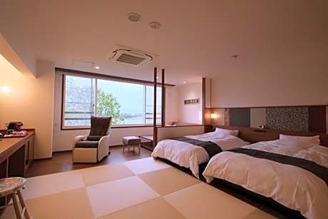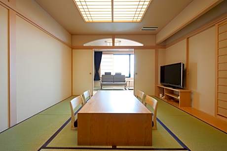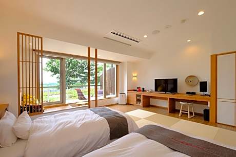 Guests will have a special experience as the quadruple room offers a private open-air bath. The spacious quadruple room provides air conditioning, tatami, as well as a private bathroom featuring a bath and a shower. The quadruple room features a flat-screen TV, a tea and coffee maker, a wardrobe, a safe deposit box as well as river views. The unit offers 4 futons.