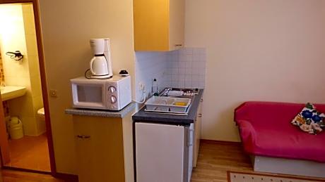The room features satellite TV, a kitchenette, and has an private bathroom with a hairdryer.