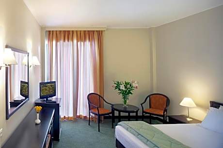 Enjoying a privileged location in the outskirts of Preveza, Margarona Royal Hotel features a large swimming pool and a furnished sun terrace facing Amvrakikos Gulf. Surrounded by a protected ecosystem, nesting over 250 rare bird species, Margarona Hotel also includes a lounge bar with fireplace, a classically decorated restaurant and 3 meeting rooms. The 111 rooms and 4 suites are fitted with carpeted floors and dark-wooden furnishings and offer views to the gulf and the hotel gardens. Each unit is equipped with all modern facilities, such as air conditioning, flat-screen satellite TV, high speed internet access and fridge. Ironing facilities can be provided upon request. Guests can start their day with a rich American breakfast served daily at the on-site restaurant, where lunch and dinner are also served. During the summer months, guests can enjoy a romantic dinner at the sea-view terrace. The spacious lounge bar offers a variety of coffees and drinks throughout the day. Extra services at Margarona Royal Hotel include a 24-hour front desk, car rental and express check-in/check-out. Meetings and various events can also be organized. Free WiFi access is provided in public areas. The center of Preveza, where a variety of bars, restaurants and shops are available, lies within 1.6 mi from the hotel. Parga Town is at a distance of 37 mi, while Lefkada Island can be reached within a 35-minute drive. Free on-site parking is provided.