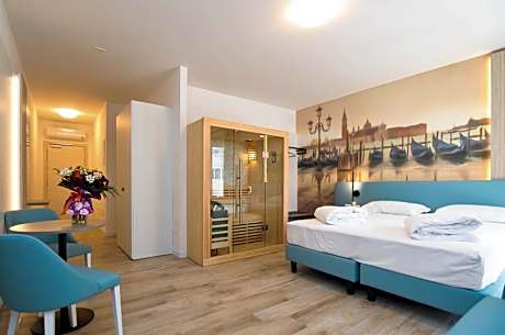 Located in Caorle, a 3-minute walk from Spiaggia di Levante, Marina Junior Suite 4 Stelle S has accommodations with a shared lounge, private parking, a restaurant and a bar. Located around a 11-minute walk from Aquafollie Waterpark, the hotel with free WiFi is also 1.1 miles away from Caorle Archaeological Sea Museum. A spa and wellness center comprising a fitness center, an outdoor swimming pool, a sauna, as well as a terrace can be used by all guests. At the hotel rooms include air conditioning, a seating area, a flat-screen TV with satellite channels, a safety deposit box and a private bathroom with a bidet. Rooms are equipped with an electric tea pot, while certain rooms have a balcony and others also feature pool views. The rooms will provide guests with a fridge. Guests at Marina Junior Suite 4 Stelle S can enjoy a continental breakfast. The accommodation offers a hot tub. You can play table tennis at Marina Junior Suite 4 Stelle S, and bike rental is available. Languages spoken at the 24-hour front desk include German, English and Italian. Duomo Caorle is a 12-minute walk from the hotel, while Madonna dell'Angelo Sanctuary is 0.6 miles from the property. Venice Marco Polo Airport is 32 miles away.