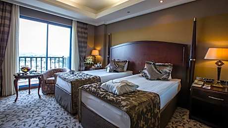The Merit Lefkoşa is a stylish hotel offering a traditional hammam, indoor and outdoor pools and an on-site casino. Its rooms are decorated with warm colors and have free Wi-Fi. The rooms feature an elegant décor and rich fabrics. The spacious bathrooms are decorated with blue tiles, granite countertops and gold plated taps. Each room offers a hot and cold drink facility and satellite flat-screen TV. Guests can relax in the Merit’s spa complete with marbled hammam, glass enclosed swimming pool and massage services. There is also an outdoor pool and a fitness center for exercising. A buffet and a varied dining menu are offered at several restaurants. The hotel includes a cozy bar with plenty of seating and large windows. The Lefkoşa Merit offers a 24-hour room service, along with laundry and dry cleaning services. It also offers free indoor parking and a beauty salon. The middle of Nicosia is just a 5-minute drive from this Cyprus hotel. Ercan Airport is 16 miles away.