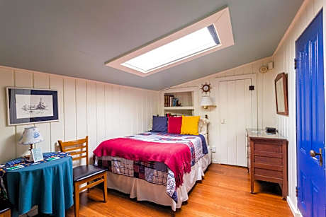 Our Venetian Room, filled with Italian art, is an upstairs room with French doors opening to a private balcony, queen bed, air conditioner and bathroom with claw-foot tub/shower.