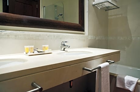 This modern and comfortable room features sloping ceilings, a mini-bar and a safe. It also has air conditioning, heating and a satellite TV. The bathroom comes with a double sink and a hairdryer. Free WiFi is available.