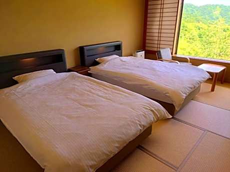 The quadruple room includes a private bathroom, well-fitted with a bath, a shower, a bidet, a hairdryer and slippers. The air-conditioned quadruple room provides a flat-screen TV with satellite channels, tatami, a tea and coffee maker, a wardrobe as well as mountain views. The unit offers 2 beds.