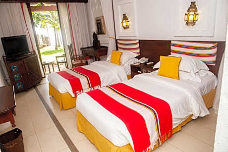 Right on the white sandy beach of Shanzu, Serena Beach Hotel & Spa offers panoramic views of the Indian Ocean. Guests can dine next to the outdoor pool in the extensive tropical gardens. All of the spacious, air-conditioned rooms feature Swahili-style décor with beds surrounded by a mosquito net. Each room comes equipped with a TV, minibar and has a private bathroom. Serena Hotel features a variety of indoor and outdoor restaurants and bars, many of which play lively music. Room service is available and guests can enjoy a cocktail on their private balcony. Breakfast is served in the terrace. A variety of outdoor activities are available including volley ball, pedalos, windsurfing and yachting. After an active day guests can relax with a massage in the Maisha Spa and Health Club. Free private parking is available on site and there is free Wi-Fi throughout. The 24-hour front desk can organize an airport shuttle to Moi Airport 11 miles away.