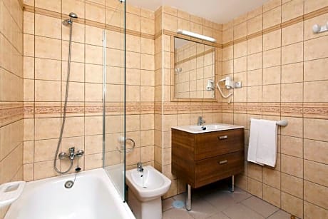 All the apartments have a separate bedroom, a bathroom with bathtub/shower and hairdryer. The kitchen area is furnished with a 4 sits table, ceramic hob, microwave, small refrigerator, coffe machine, dishes, cutlery and further basic cooking tools. The living room has a sofabed and a 32” flat satellite TV. All the furniture and decoration elements have been properly updated for your comfort. The apartment capacity is up to 3 persons.