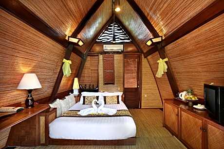 Set in tropical landscaped gardens, each freestanding hut has a balcony, outdoor bathroom and private, open-air living area. Please note that this room type cannot accommodate an extra bed.