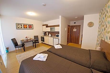 Predela 2 Aparthotel is just 2297 feet from the closest ski elevator and about 0.6 mi from Bansko’s Old Town. It features accommodations units with a flat-screen cable TV and free WiFi. The spa area on site offers a hot tub, an indoor swimming pool, a steam bath and a sauna. All units have a kitchen or a kitchenette. A balcony and a bathroom with a shower and amenities are provided in each unit. The apartments feature a large seating area with a sofa bed. The spa area is consisting of a hot tub, an indoor swimming pool, a steam bath and a sauna. Massages are provided on request and you also can work out in the on-site gym. The café next to the spa center offers breakfast, hot and cold drinks and snacks. A playground ensures the children’s entertainment. Ski storage, skiing lessons and ski rental are available as well. The train station is 1.2 mi away and free private parking is possible in front of the building. Airport transfers are available on request.