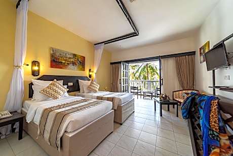 PrideInn Flamingo Beach Resort & Spa Mombasa is set among landscaped gardens with tropical palm trees and a lagoon-shaped swimming pool. Offering 2 restaurants and 4 bars, this resort is located directly on the beach overlooking Mombasa Marine Park. All of the very spacious rooms feature a balcony with a choice of Indian Ocean, pool or garden views. They are stylishly furnished with mosquito nets surrounding luxury bed linens and each has a flat-screen TV. Palm Restaurant has themed buffet meals for breakfast, lunch and dinner. Blue Lagoon includes a diverse à la carte menu overlooking the pool. There are light snacks and beverages throughout the various bars, some with Indian Ocean views. All rooms have balconies; upgraded rooms add living areas. Room service is available 24/7. A variety of appetizing meals are served in our restaurant. Amenities include a landscaped lagoon-style pool, a spa and a gym, as well as 2 relaxed bars . Mombasa’s center and Fort Jesus are a 20-minute drive away. An airport shuttle is available at a fee for Moi International Airport, 16 mi away.
