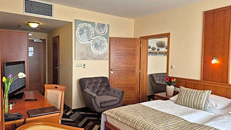 The modern family Primavera Hotel & Congress center is located on the outskirts of Plzen, 0.9 mi from the D5 / E50 motorway, and offers you Czech and International cuisine, free parking and free internet in all rooms. All rooms are air-conditioned and some rooms also have a balcony. Guests can enjoy a meal either at the Primavera restaurant with an open-air summer terrace or at the wine bar. Primavera Hotel & Congress center is within easy walking distance from a shopping and entertainment center including a cinema. A couple of conference halls and a number of fully-equipped meeting rooms are available. It is only a 15 minute journey to the city center by public transport from the Primavera hotel.
