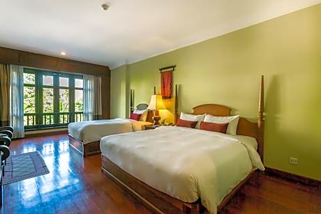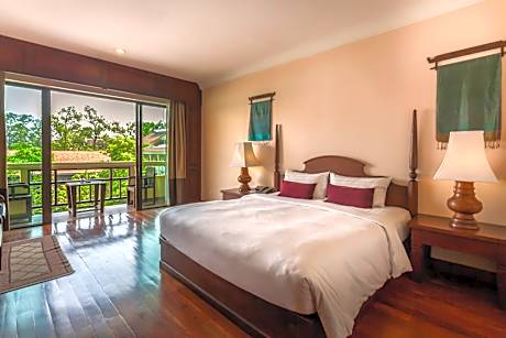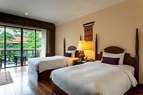 Room features a private balcony or terrace with pool and garden views, and a seating area. Each room has cable TV and tea/coffee making facilities.