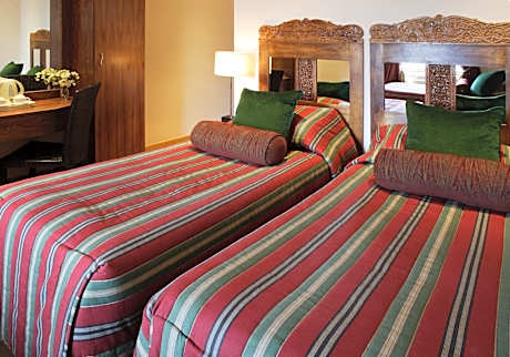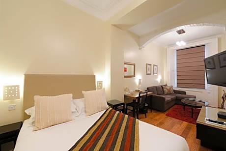 A flat-screen TV is included in each wood-floored room, which also has a private marble bathroom.