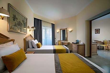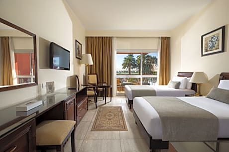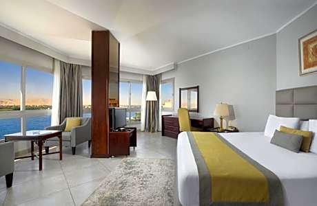 On the banks of the Nile, this resort offers air conditioned rooms with views of the river, tropical grounds, or outdoor pools. It is located in the center of Luxor and half a mile from Luxor Temple. A satellite/cable TV and a minibar are in Pyramisa’s spacious rooms. Each comes with a sitting area, and a private bathroom with bathtub and shower. International buffet meals, including breakfast, are served daily at Lotus Restaurant. Isis Hotel has a barbecue terrace, and a Chinese and an Italian themed restaurant. In the evening, there is live entertainment in the bar. Various beauty treatments are available at the salon. Guests can also work out at the gym or play a game of racquetball. Pyramisa Hotel Luxor is 6 miles from Luxor Airport, and the staff can arrange a shuttle.