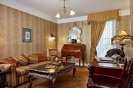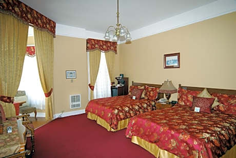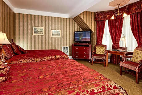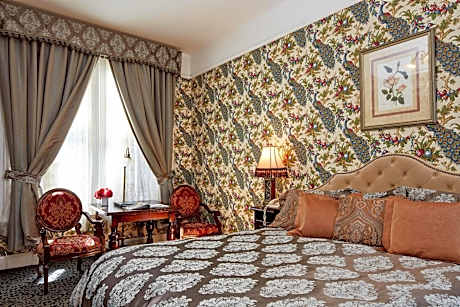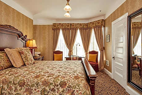 Each room at Queen Anne Hotel is uniquely decorated, featuring a seating area, hairdryer, and luxurious bathroom with premium toiletries. Select rooms offer added features like wood-burning fireplaces and DVD players, enhancing the guest experience.