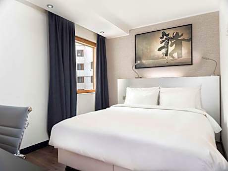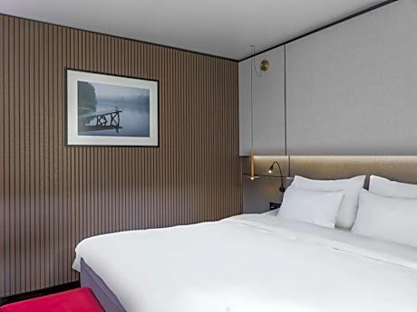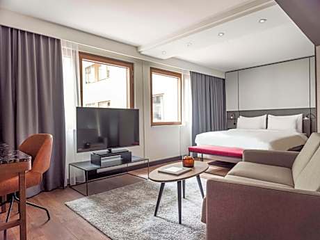 This cozy room is decorated with contemporary Scandinavian design and furnishings. It features a TV with mirror casting, mini fridge and tea/coffee making facilities.