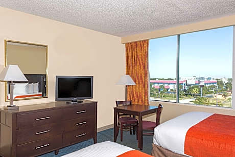 This Kissimmee hotel offers a free scheduled transfer service from Walt Disney World and other area theme parks. Two outdoor pools and a mini-golf course are on site. Free WiFi is provided. A refrigerator, cable TV, and tea and coffee-making facilities are standard in every room at this Kissimmee Gateway Ramada by Wyndham. Most rooms offer views of the tropical garden or pool. The Kissimmee Ramada features billiards tables and an arcade room. The covered garden area houses 2 table tennis tables. Guests can work out in the fitness center or on the basketball court. Security is available 24 hours a day. Smokehouse Grill and Lounge serves traditional American fare for breakfast. Mulligan's Sports Bar serves wine, beer, and cocktails with appetizers. Snacks and pizza can be purchased at the Deli and Andy's Pizza. Disney Springs is 8 mi from Ramada by Wyndham Kissimmee Gateway - Free Theme Park Shuttle, while SeaWorld is a 14-minute drive away. The hotel is also 15 mi from Universal Studios Orlando and Islands of Adventure.