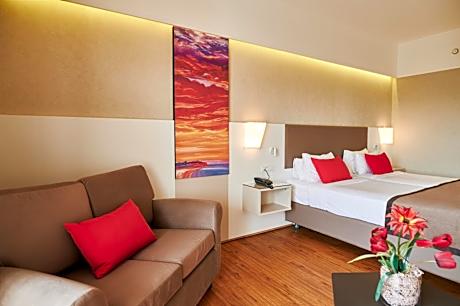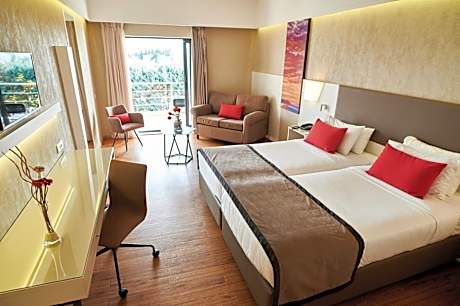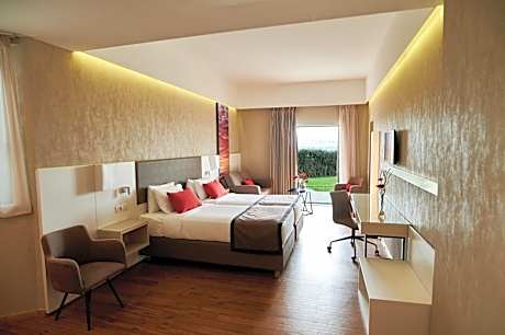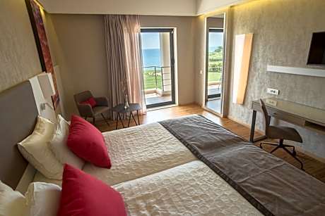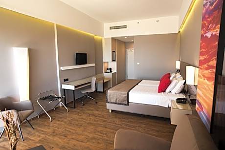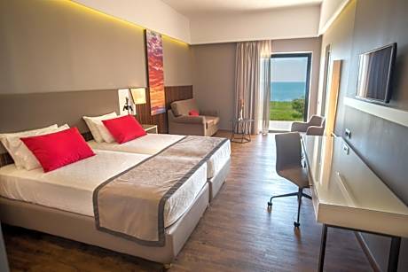 Ramada Plaza by Wyndham Thraki is set on a private beach at the west end of Alexandroupolis. Known for its top-rated conference facilities, the 5-star hotel also offers 2 outdoor pools and a luxurious thalasso spa center. Each of the tastefully decorated rooms features a spacious balcony with view of the swimming pools and the Aegean Sea. In-room amenities include air-conditioning, 32 " LED TV with video-on-demand and free internet access. Upon arrival, 2 bottles of water and fruits are offered. The hotel’s Thalasso & Wellness Spa includes 14 treatment rooms and a relaxation area with health bar, available to guests over 16 years old. Guests enjoy free access to the fully equipped fitness center, while a range of outdoor sports activities may be enjoyed. A rich daily breakfast buffet is served at the Allegro restaurant with its lovely veranda. During the day guests can sample traditional Thracian cuisine, as well as international dishes. Coffee or cocktails can be enjoyed in the Avra Pool Bar or the piano bar Thalassa. The complex is 2.5 mi from Alexandroupolis city center. Democritus International Airport is 5.6 mi away, whereas the port and the railway station of Alexandroupolis are 2.5 mi away. Free private parking is possible on site.