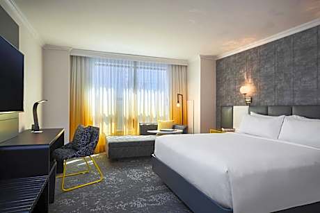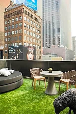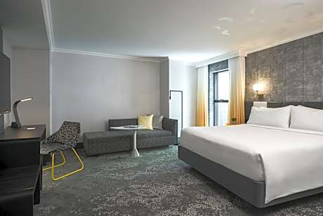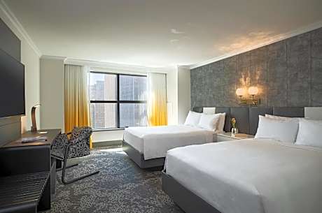 The Renaissance New York Times Square by Marriott is located in Theater District and features 312 soundproofed guests rooms spread over 26 floors. It has 7 terrace guest rooms and 5 suites. Located on Seventh Avenue and West 48th Street, the property is 413 feet from the subway station on 49th Street. All rooms at the property come with Renaissance’s own bedding and linens, dark-wood furniture and gold-and-blue accents. Floor to ceiling windows offers guests views of the city. Other in-room amenities include flat-screen TVs with plug-in connectivity panels. Renaissance New York Times Square by Marriott South has a fitness center, concierge service and an onsite lounge called R Lounge. Parking is available for a fee. LaGuardia Airport is 9 mi from the property while JFK Airport is 17 mi away. Newark Liberty International Airport is 18 mi from the property. Times Square is 135 feet away.