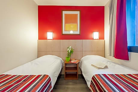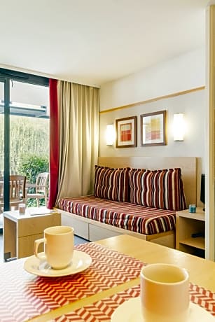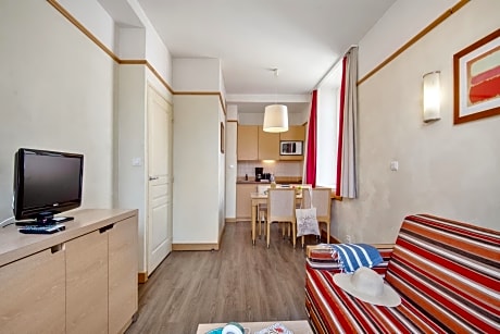 This apartment features a living area with one double sofa bed. There is also one bedroom with 2 single beds. It has one independent bathroom with a bath. The fully equipped kitchenette opens onto the living area.