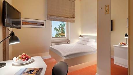 This small double room overlooks the garden in front of the house and is located over all 4 floors.