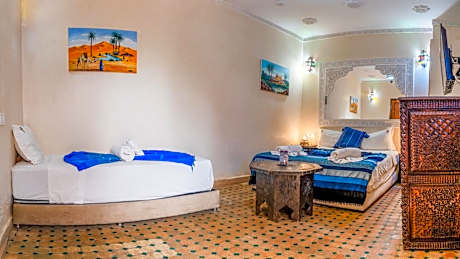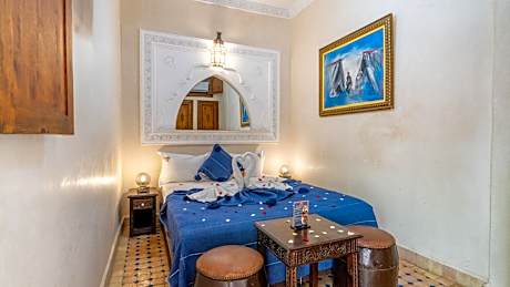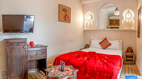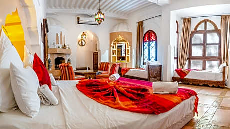 This luxury double room is connected to the main building by the upstairs hallway, is decorated in Moroccan style following a magenta theme, offers a private bathroom, has air conditioning and satellite TV.