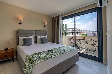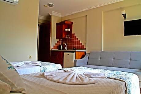 Rosy Suites Hotel provides beachfront accommodations in Kuşadası. Among the facilities of this property are a restaurant, a 24-hour front desk, and an elevator, along with free Wifi throughout the property. There's free private parking, and the property provides a paid airport shuttle service. The units at the condo hotel come with air conditioning, a flat-screen TV with satellite channels, a kitchen, a dining area, a safety deposit box, and a private bathroom with a shower, a hair dryer, and free toiletries. Every room includes a rooftop pool featuring sea views. At the condo hotel, every unit includes bed linen and towels. There is a coffee shop, and a mini-market is also available. Guests can also relax in the garden or on the sun terrace. Kadinlar Beach is a 1-minute walk from the condo hotel, while Kusadasi Marina is 3.2 miles away. Izmir Adnan Menderes Airport is 52 miles from the property.