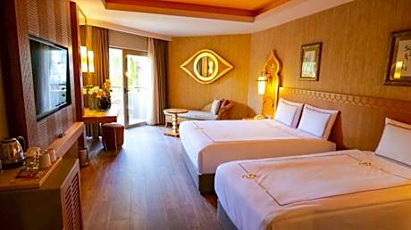 This Chinese-themed beach resort on the Turkish Riviera features indoor and outdoor pools, an amusement park, bowling alley and a spa. It offers all-inclusive accommodations on the Mediterranean beachfront. Royal Dragon Hotel features 2 floodlit tennis courts and a well-equipped gym. The hotel’s spa offers a hammam and sauna as well as a hot tub and massage rooms. All the air-conditioned rooms feature a balcony with panoramic sea or land views. Each room has carpet floors and is furnished with a sitting area and vanities. A satellite flat-screen TV, minibar and safe are also available. Children can have lots of fun at the Dragon Hotel’s amusement park and outdoor swimming pool with multiple slides. There is also a game room offering video games and a Mini-Club for kids under 12. An open buffet breakfast is served each morning. The Patiserria serves fresh cake and pastries. Guests can choose from 4 different on-site restaurants serving Italian, Asian and local cuisine. The Royal Dragon is 3 miles from the town of Side. Antalya International Airport is 33 miles away. Free private parking is available on site.