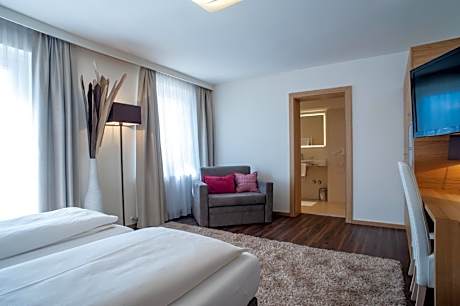 The Rumer Hof is a 4-star hotel located 0.6 mi away from Rum's center, and 3.1 mi each from Innsbruck and Hall in Tirol. The restaurant serves traditional Tyrolean cuisine and international dishes. A sauna and an infrared cabin can be used free of charge. All rooms are furnished with high-quality modern furniture. Information folders are available in all rooms. Rooms with a balcony are available on request. The Rumer Hof Bus Stop is directly in front of the hotel and provides connections to Innsbruck Main Train Station (line 504). An indoor swimming pool, a swimming lake, a billiards café, and shopping facilities are nearby. A gym with a fitness area, sauna and steam bath is just a short walk away and can be used free of charge by guests.